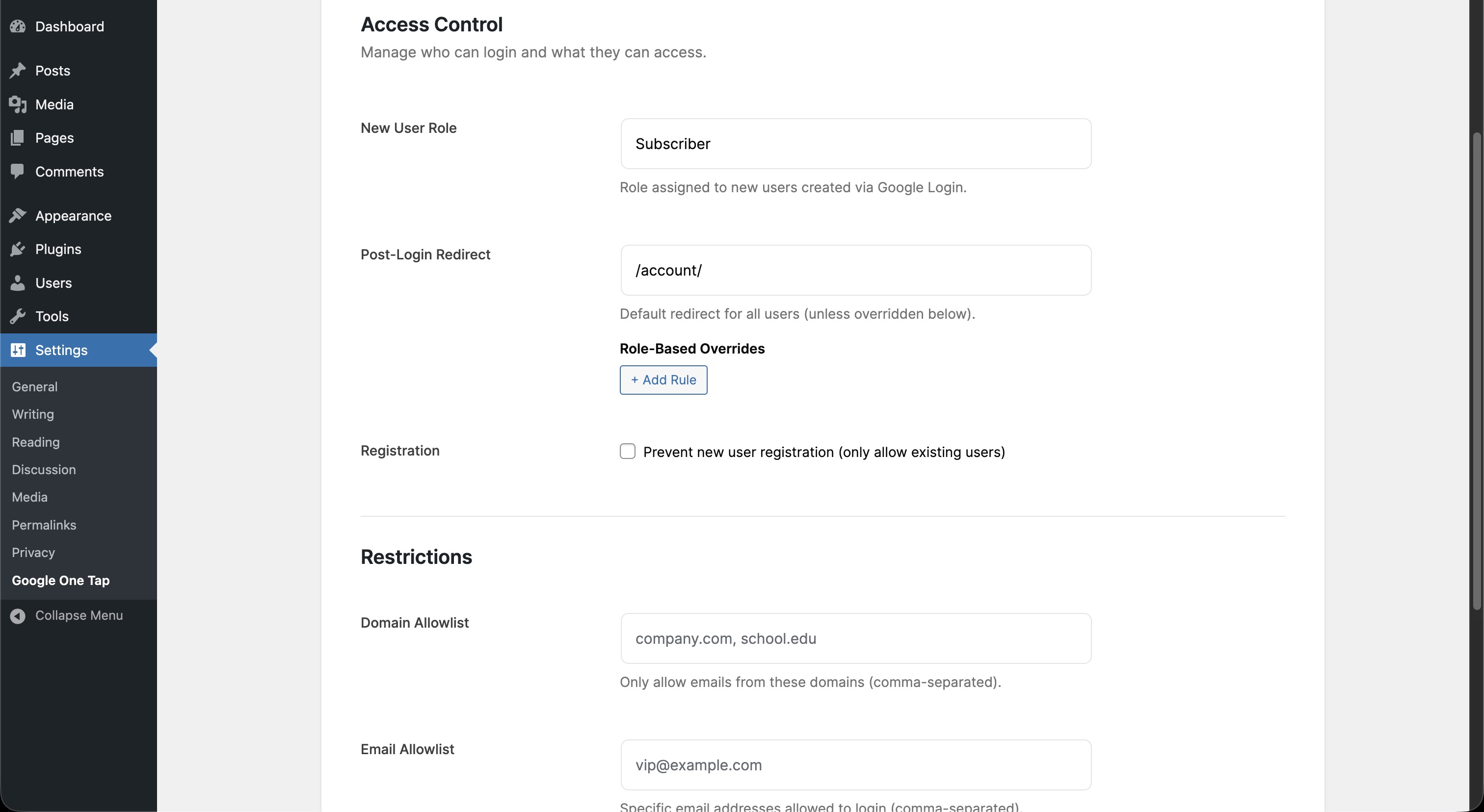 - Optional email domain allowlist