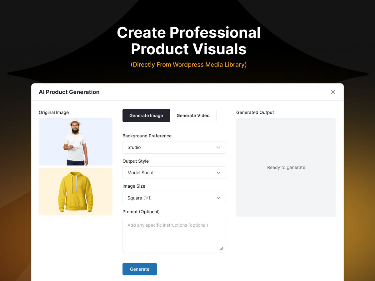 Create product images using your existing WooCommerce product images, without expensive photoshoots or third-party tools.