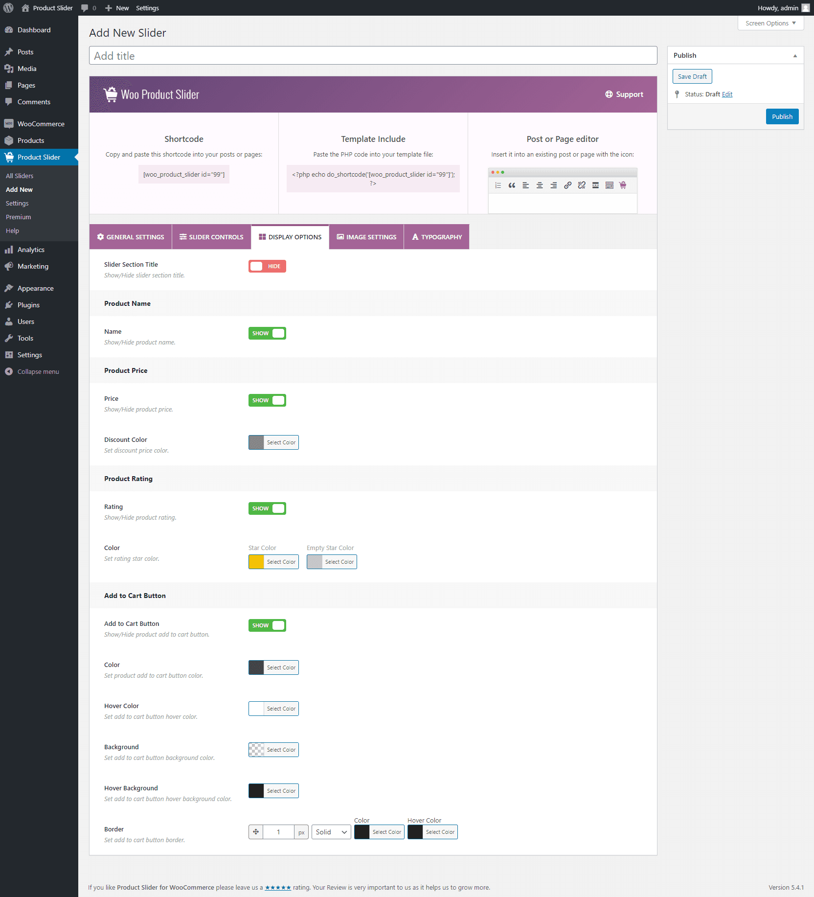 Go to Product Slider > and click “Add New” menu and you will find a Shortcode Generator Settings panel.